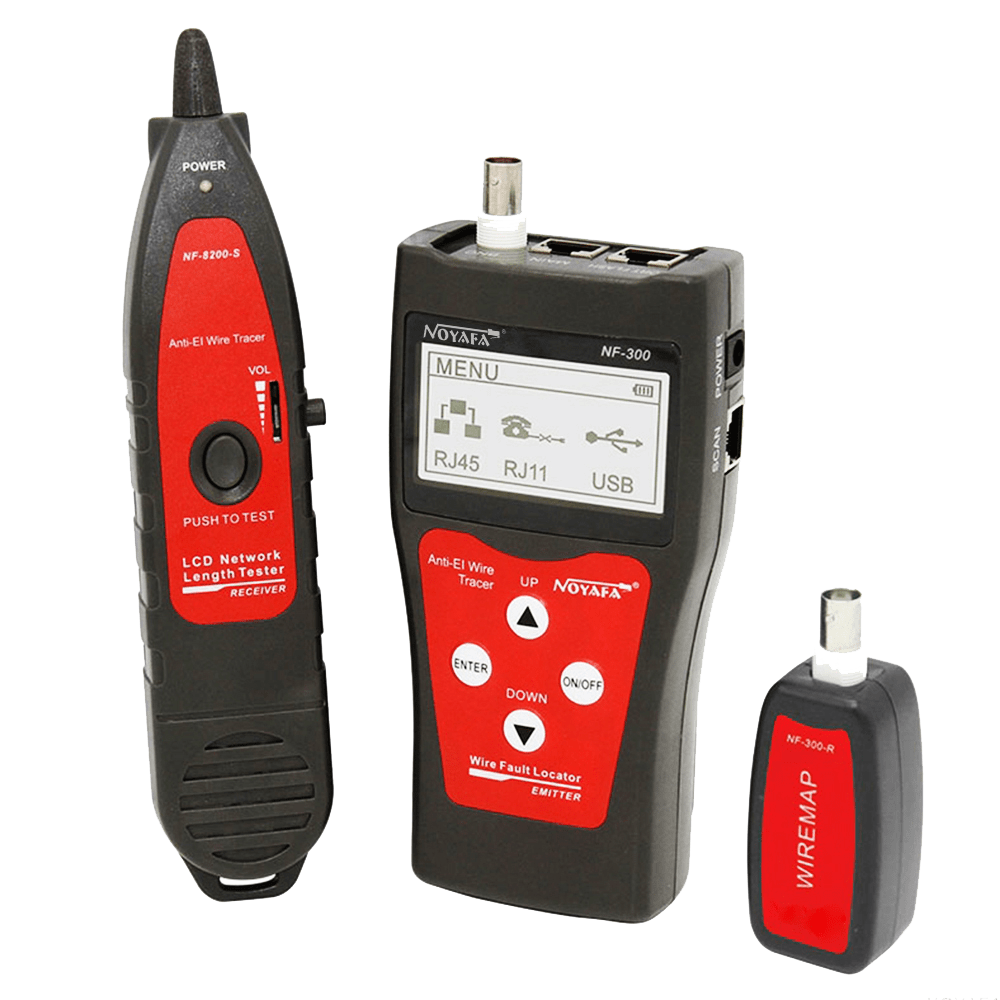 Модель NF-300 обладает повышенной устойчивостью к интерференции сигнала. Прибор состоит из трех компонентов: тестера (NF-300), приемника (NF-300-S) и датчика (NF-300-R). Он предназначен для тестирования витых пар, в том числе, для определения длины кабеля, обнаружения кабеля, помех от фаз, точек перекрестных помех и обрыва и может использоваться при монтаже и обслуживании низковольтных коммуникационных и прочих сетей. Он широко применим при обследованиях телефонных, компьютерных и прочих цепей из металлических проводников.