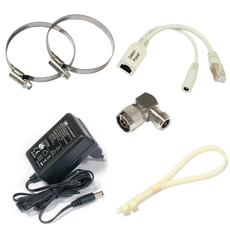 В комплекте идет сам маршрутизатор RouterBOARD Metal 5SHPn, монтажные хомуты, PoE инжектор и адаптер питания.