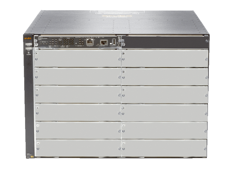 Порты (12) свободных слотов для модулей поддерживает до 288 портов 10/100/1000 с автоматическим определением скорости, 288 портов SFP, 96 портов SFP+, 96 портов HPE Smart Rate Multi-Gigabit или 24 порта 40 GbE, либо их сочетание