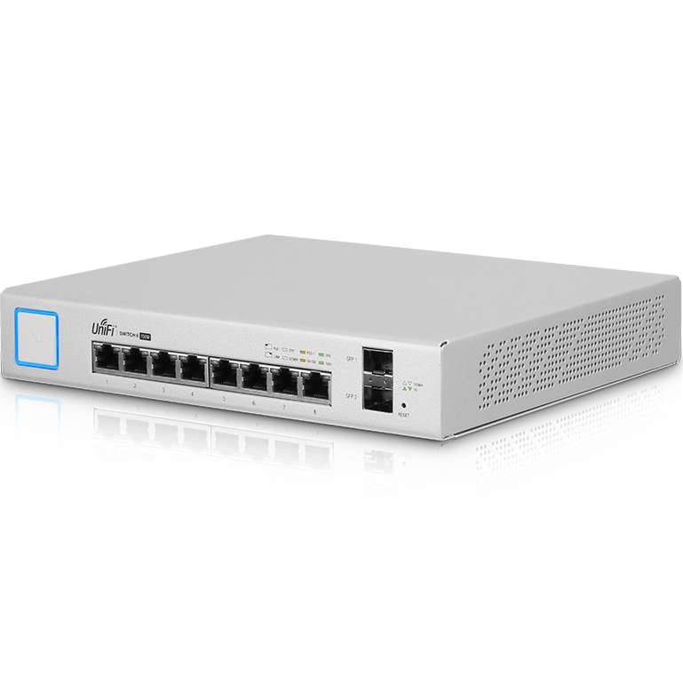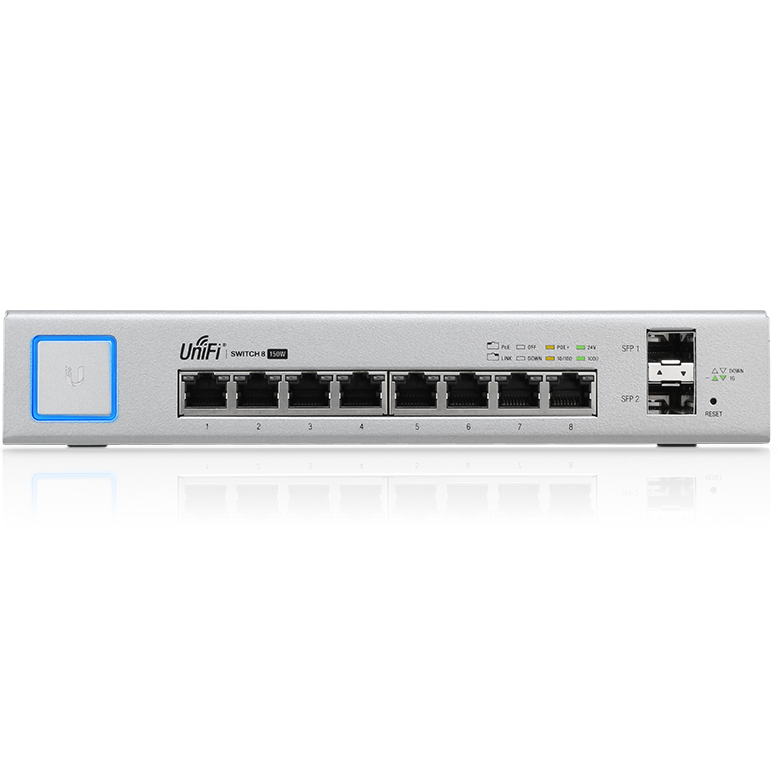 Является младшей моделью в серии коммутаторов UniFi и представляет собой управляемый 8-портовый гигабитный коммутатор PoE с производительностью более 10 Гб/с. Поддерживается электропитание подключенных устройств по PoE c суммарной мощностью до 150 Вт. Каждый порт может быть настроен на подачу электропитания стандарта 802.3 af/at или пассивного PoE 24 В. Устройство имеет 8 портов Ethernet 10/100/1000 и два SFP 1 Gbps порта для подключения к оптоволоконным сетям. Ubiquiti UniFi Switch US-8-150W выполнен в надежном металлическом корпусе настольного исполнения. Для управления устройством требуется наличие в сети программного контроллера Unifi Controller или аппаратного контроллера UniFi Cloud Key.