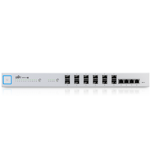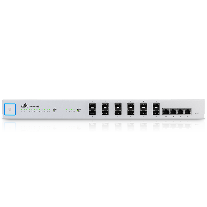 UniFi Switch 16 XG новый мощный коммутатор уровня аггрегации, обладающий сверхвысокой пропускной способностью (Non-Blocking Throughput) до 160 Гбит/c. Устройство имеет 16 10-гигабитных портов (12 оптических SFP+ и 4 порта RJ45 10GBASE-T), 1 последовательный консольный порт. Ubiquiti UniFi Switch 16 XG выполнен в надежном металлическом корпусе. Для управления устройством требуется наличие в сети программного контроллера Unifi Controller или аппаратного контроллера UniFi Cloud Key.