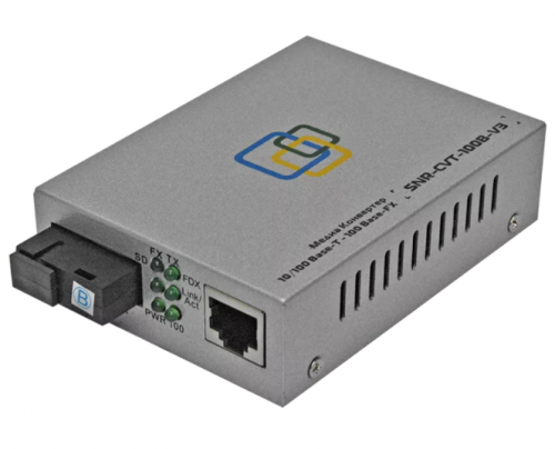 Медиаконвертер SNR-CVT-100A-V3 и SNR-CVT-100B-V3 осуществляют преобразование интерфейсов «витая пара - одномодовый оптический кабель по одному волокну» для сетей Ethernet 10/100BASE-TX и 100BASE-FX. Устройства позволяют одновременно передавать и получать сигналы на длинах волн 1310 нм и 1550 нм по одному оптическому волокну на расстояние до 20 км. Медиаконвертеры имеют 1 порт RJ-45 для витой пары и 1 порт для оптического кабеля (SC-коннектор). На порту для витой пары реализована поддержка автоматического определения скорости, режимов работы (полнодуплексный или полудуплексный), полярности MDI/ MDI-X, что упрощает установку медиаконвертера в существующей сети.