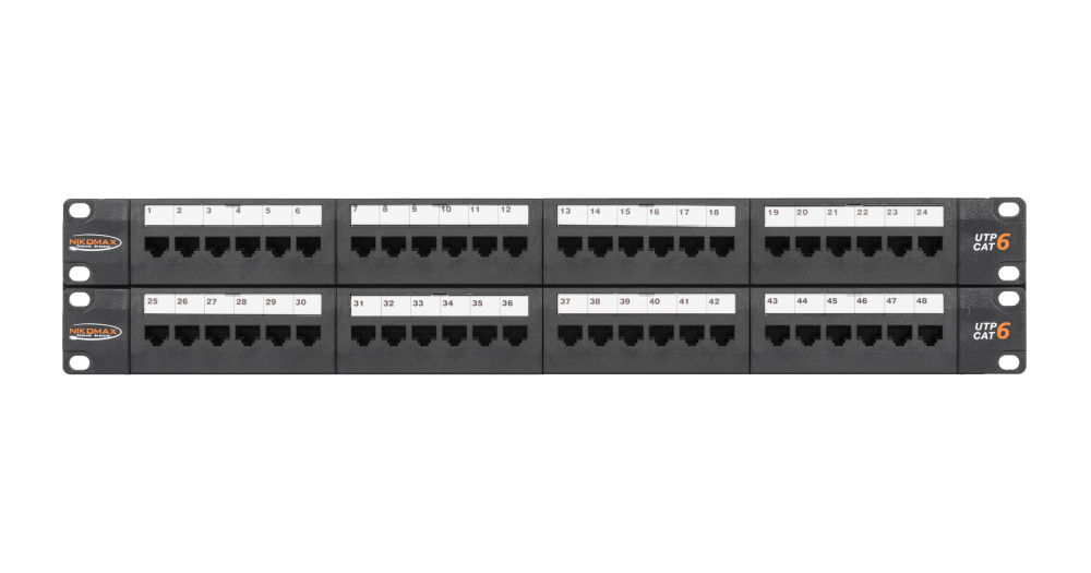 Коммутационные панели (патч-панели) предназначены для монтажа кабелей в различных подсистемах СКС и подключения отдельных составляющих сети друг к другу при помощи коммутационных шнуров. Неэкранированные патч-панели NIKOMAX выполнены в черном цвете и предназначены для монтажа в 19” шкаф или стойку. Панели NMC-RP24UE2-1U-BK имеют стандартную высоту в 1U и вмещает 24 порта RJ45/8P8C. С тыльной стороны патч-панелей размещены контакты 110 типа с цветной маркировкой по двум стандартам: T568 А и B. Особый дизайн контактов также позволяет использовать для заделки кабелей ножи типа KRONE. Для удобства администрирования все порты пронумерованы, а также имеются дополнительные площадки для маркировки. В комплекты патч-панелей входят удобные съемные органайзеры для разводки входящих кабелей.