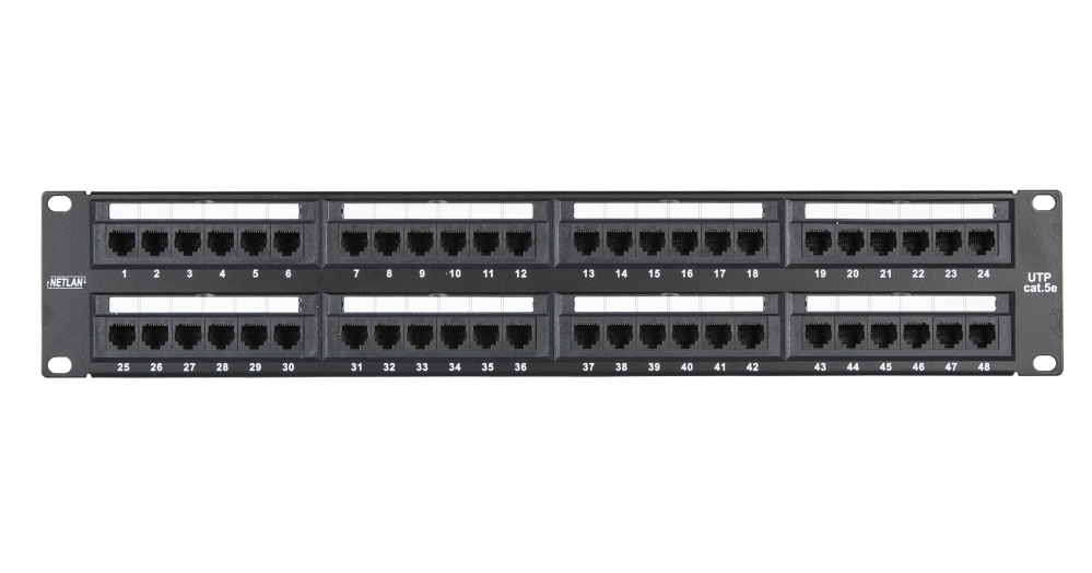 Патч-панель EC-URP-48-UD2 предназначена для монтажа в шкаф или стойку 19", и имеет 48 портов RJ45/8P8C категории 5е. Патч-панель выполнена в классическом черном цвете, имеет универсальные контакты 110/KRONE с цветовой маркировкой по стандарту T568A/B с тыльной стороны. Для удобства администрирования все поры пронумерованы, а также на патч-панелях имеются дополнительные маркировочные площадки.