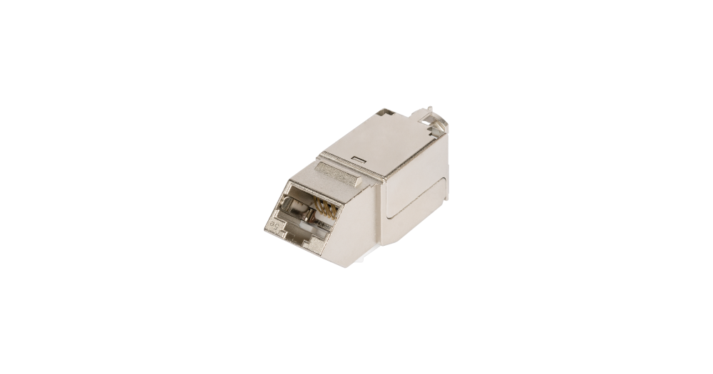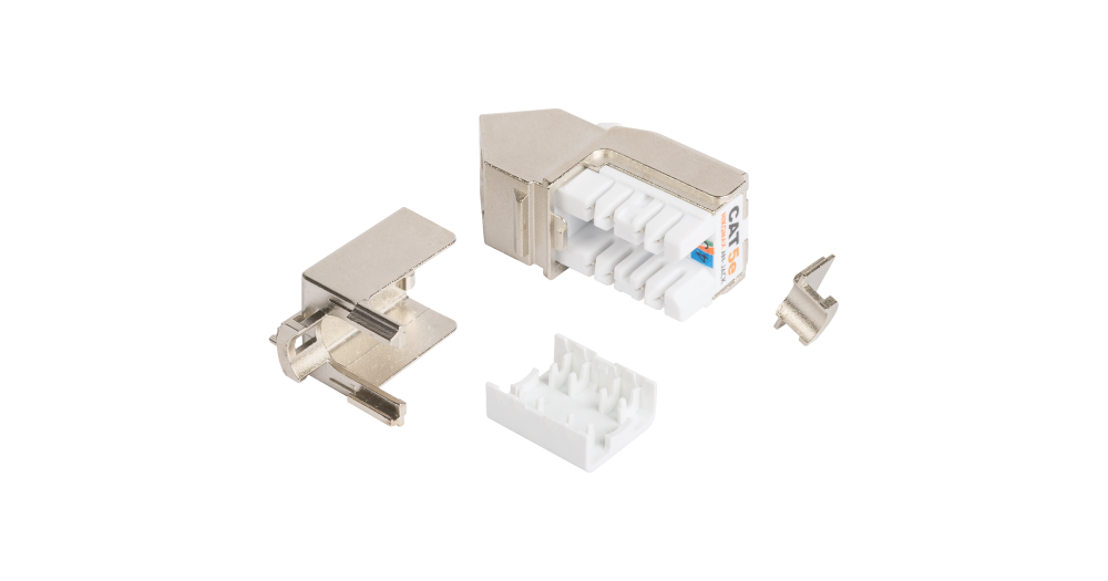 Модуль NMC-KJSD2-AN-MT (кат.5е) выполнен в литом, полностью экранированном корпусе из цинк-алюминиевого сплава. Экран кабеля заземляется на хвостовик на верхней крышке модуля и снизу дополнительно прижимается клипсой, обеспечивающей полный электрический контакт с корпусом. Конструкция закрепляется при помощи нейлоновой стяжки. На хвостовике также имеется крепление для заземляющего провода.