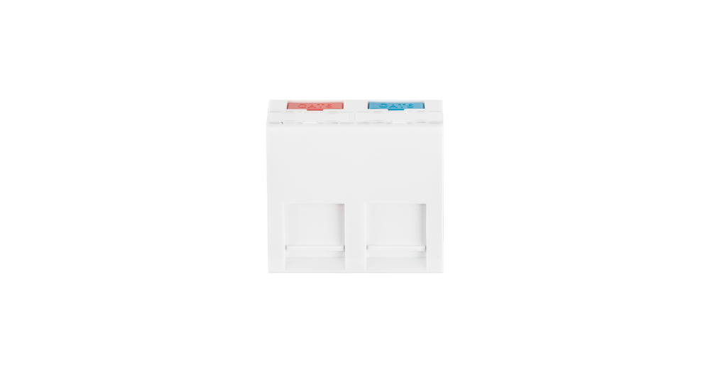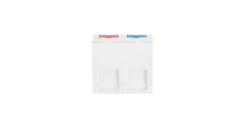 В NMC-PM2P-AF-WT устанавливаются 2 модуля Keystone любого типа. Вставки снабжены шторкой для защиты гнезда от попадания пыли при отключенном коммутационном шнуре. В комплекте со вставками идет набор цветных иконок. Кроме этого имеются дополнительные площадки для маркировки, закрытые съемными прозрачными крышками.