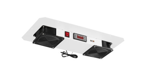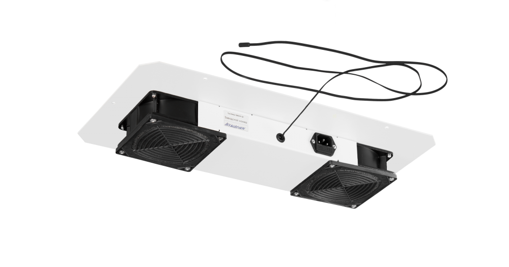 Вентиляторный блок предназначен для принудительного охлаждения активного оборудования, установленного в телекоммуникационном шкафу, путем отвода теплых воздушных масс из внутреннего объем шкафа. Блок устанавливается в специальную нишу потолочной панели настенного шкафа TLK серий TWM. Питание вентиляторного блока на 2 вентилятора осуществляется с помощью подключения шнура питания к сети с напряжением 220 В, 50 Гц. Разъем питания на вентиляторном блоке типа IEC-60320 C14. В средней части вентиляторного блока TLK-FAN2-TERM-F-GY дополнительно установлен терморегулятор с дисплеем и датчиком температуры, выведенным сзади. Датчик осуществляет мониторинг температурной обстановки внутри шкафа и при необходимости осуществляет включение/выключение вентиляторов в зависимости от настроек температуры. Шнур датчика температуры имеет длину 1,5 метра. Вентиляторы закрыты c одной стороны защитными решетками, а с другой стороны защитными решетками с фильтрами для предотвращения попадания пыли во внутреннее пространство шкафа. Вентиляторный блок конструктивно выполнен с монтажным фланцем для удобства установки. Несущая конструкция вентиляторного блока выполнена из 2 мм стали. Антикоррозионное покрытие выполнено ударопрочной порошковой краской серого цвета.