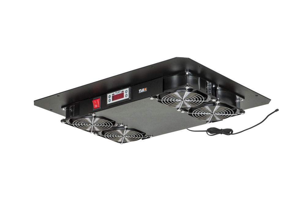 Вентиляторный блок предназначен для принудительного охлаждения активного оборудования, установленного в телекоммуникационном шкафу, путем отвода теплых воздушных масс из внутреннего объем шкафа. Блок устанавливается в специальные ниши на крыше или в основании напольных шкафов TLK и совместимы с сериями TFE, TFL, TFR, TFA. При этом шкафы глубиной (600 мм) предусматривают только верхнее размещение вентиляторного блока. Для более подробной информации сверьтесь с таблицей в разделе "Описание" к шкафу. Питание вентиляторного блока на 2 вентилятора осуществляется с помощью подключения шнура питания к сети с напряжением 220 В, 50 Гц. Разъем питания на вентиляторном блоке типа IEC-60320 C14. В средней части вентиляторного блока TLK-FAN4-TERM-BK дополнительно установлен термоконтроллер с дисплеем и датчиком температуры, выведенным сзади. Датчик осуществляет мониторинг температурной обстановки внутри шкафа и при необходимости осуществляет включение/выключение вентиляторов в зависимости от температуры. Шнур датчика температуры имеет длину 1,5 метра. Вентиляторы закрыты решетками с обеих сторон. Вентиляторный блок конструктивно выполнен с монтажным фланцем для удобства установки. Несущая конструкция вентиляторного блока выполнена из 2 мм стали. Антикоррозионное покрытие выполнено ударопрочной порошковой краской черного цвета.