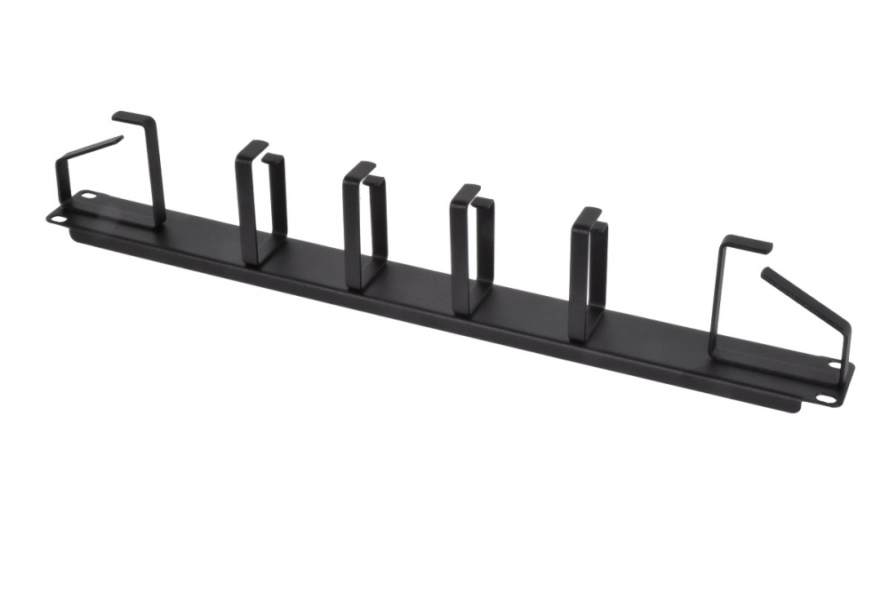 Горизонтальные органайзеры предназначены для удобного размещения коммутационного кабеля. Выполнен из цельнометаллической панели высотой 1U. На лицевой стороне органайзера размещены 6 металлических колец для фиксации кабеля. Имеет порошково-полимерное покрытие черного цвета.