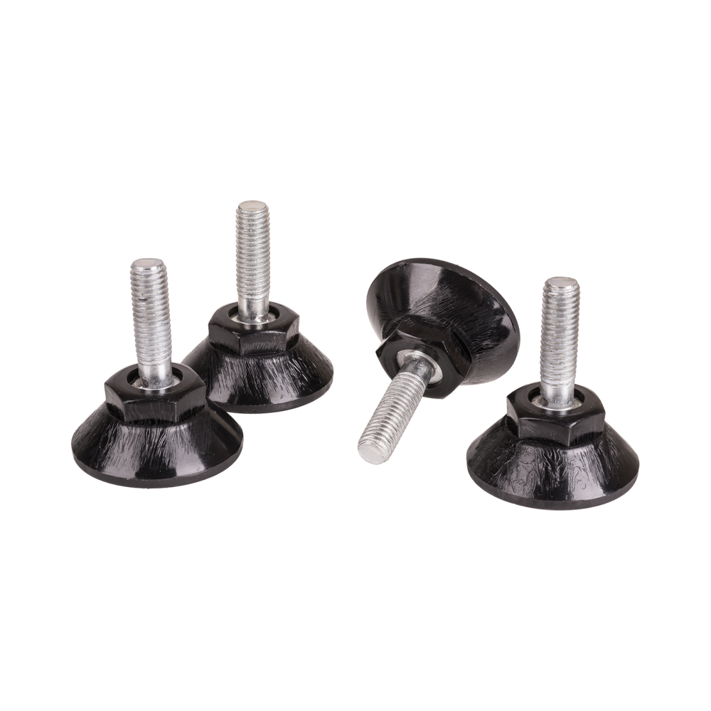 Опоры регулируемые без поворотной основы предназначены для компенсации неровностей пола и выравнивания положения напольных шкафов и стоек. Данные опоры состоят из резьбового стержня и опорной чашки. Выкручивая или закручивая опору можно регулировать положение ее в вертикальной плоскости. Резьбовая часть опоры выполнена из оцинкованной стали. Опорная чашка выполнена из PBT черного цвета. Максимально допустимая распределенная нагрузка 250 кг на каждую опору. Представленные опоры можно устанавливать на шкафы и стойки в соответствии с таблицей совместимости аксессуаров