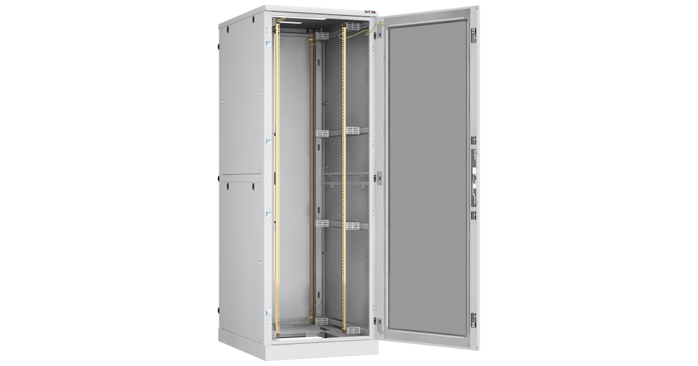 В базовой комплектации шкафа идут 4 монтажных 19” профиля, регулируемых по глубине. Для удобства монтажа и обслуживания установленного в шкафу оборудования конструкцией шкафа предусмотрен доступ с четырех сторон, через переднюю и заднюю дверь, боковые легкосъемные стенки. Боковые стенки шкафа утоплены внутрь каркаса, запираются на защелки и замки с ключами. Передняя и задняя дверь имеет ручку с замком. Передняя/задняя дверь может быть цельнометаллической, перфорированной или со вставкой из ударопрочного, тонированного в массе стекла. . Имеется возможность установить левое/правое открытие двери на этапе сборки, либо же перенавесить двери после сборки шкафа. Угол открытия дверей — 180 градусов. Боковые стенки доступны в сплошном или перфорированном исполнении, а также в цельном либо в двухуровневом исполнении. Для обеспечения эффективного теплообмена и поддержания необходимого температурного режима, в крышу и основание шкафа могут быть установлены вентиляторные блоки. Наличие перфорации также повышает эффективность теплообмена. Ввод кабелей осуществляется через крышу или основание шкафа. Все части шкафа соединены в единый контур проводами заземления. Шкафы могут быть состыкованы между собой с помощью комплекта для соединения. Возможна установка шкафа на регулируемые опоры и ролики одновременно.