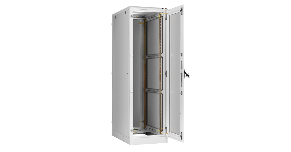 В базовой комплектации шкафа идут 4 монтажных 19” профиля, регулируемых по глубине. Для удобства монтажа и обслуживания установленного в шкафу оборудования конструкцией шкафа предусмотрен доступ с четырех сторон, через переднюю и заднюю дверь, боковые легкосъемные стенки. Боковые стенки шкафа утоплены внутрь каркаса, запираются на защелки и замки с ключами. Передняя и задняя дверь имеет ручку с замком. Передняя/задняя дверь может быть цельнометаллической, перфорированной или со вставкой из ударопрочного, тонированного в массе стекла. . Имеется возможность установить левое/правое открытие двери на этапе сборки, либо же перенавесить двери после сборки шкафа. Угол открытия дверей — 180 градусов. Боковые стенки доступны в сплошном или перфорированном исполнении, а также в цельном либо в двухуровневом исполнении. Для обеспечения эффективного теплообмена и поддержания необходимого температурного режима, в крышу и основание шкафа могут быть установлены вентиляторные блоки. Наличие перфорации также повышает эффективность теплообмена. Ввод кабелей осуществляется через крышу или основание шкафа. Все части шкафа соединены в единый контур проводами заземления. Шкафы могут быть состыкованы между собой с помощью комплекта для соединения. Возможна установка шкафа на регулируемые опоры и ролики одновременно.