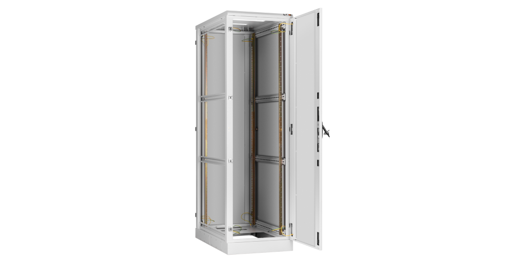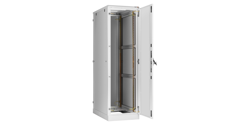 В базовой комплектации шкафа идут 4 монтажных 19” профиля, регулируемых по глубине. Для удобства монтажа и обслуживания установленного в шкафу оборудования конструкцией шкафа предусмотрен доступ с четырех сторон, через переднюю и заднюю дверь, боковые легкосъемные стенки. Боковые стенки шкафа утоплены внутрь каркаса, запираются на защелки и замки с ключами. Передняя и задняя дверь имеет ручку с замком. Передняя/задняя дверь может быть цельнометаллической, перфорированной или со вставкой из ударопрочного, тонированного в массе стекла. . Имеется возможность установить левое/правое открытие двери на этапе сборки, либо же перенавесить двери после сборки шкафа. Угол открытия дверей — 180 градусов. Боковые стенки доступны в сплошном или перфорированном исполнении, а также в цельном либо в двухуровневом исполнении. Для обеспечения эффективного теплообмена и поддержания необходимого температурного режима, в крышу и основание шкафа могут быть установлены вентиляторные блоки. Наличие перфорации также повышает эффективность теплообмена. Ввод кабелей осуществляется через крышу или основание шкафа. Все части шкафа соединены в единый контур проводами заземления. Шкафы могут быть состыкованы между собой с помощью комплекта для соединения. Возможна установка шкафа на регулируемые опоры и ролики одновременно.