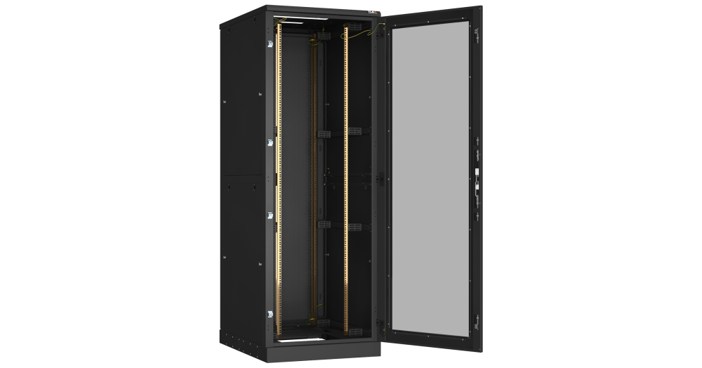 В базовой комплектации шкафа идут 4 монтажных 19” профиля, регулируемых по глубине. Для удобства монтажа и обслуживания установленного в шкафу оборудования конструкцией шкафа предусмотрен доступ с четырех сторон, через переднюю и заднюю дверь, боковые легкосъемные стенки. Боковые стенки шкафа утоплены внутрь каркаса, запираются на защелки и замки с ключами. Передняя и задняя дверь имеет ручку с замком. Передняя/задняя дверь может быть цельнометаллической, перфорированной или со вставкой из ударопрочного, тонированного в массе стекла. . Имеется возможность установить левое/правое открытие двери на этапе сборки, либо же перенавесить двери после сборки шкафа. Угол открытия дверей — 180 градусов. Боковые стенки доступны в сплошном или перфорированном исполнении, а также в цельном либо в двухуровневом исполнении. Для обеспечения эффективного теплообмена и поддержания необходимого температурного режима, в крышу и основание шкафа могут быть установлены вентиляторные блоки. Наличие перфорации также повышает эффективность теплообмена. Ввод кабелей осуществляется через крышу или основание шкафа. Все части шкафа соединены в единый контур проводами заземления. Шкафы могут быть состыкованы между собой с помощью комплекта для соединения. Возможна установка шкафа на регулируемые опоры и ролики одновременно.