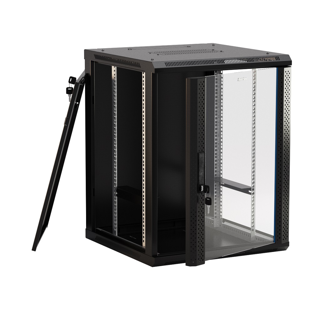 Hyperline TWB-1245-GP-RAL9004 Шкаф настенный 19-дюймовый (19"), 12U, 650x600х450мм, стеклянная дверь с перфорацией по бокам, ручка с замком, цвет черный (RAL 9004) (разобранный)