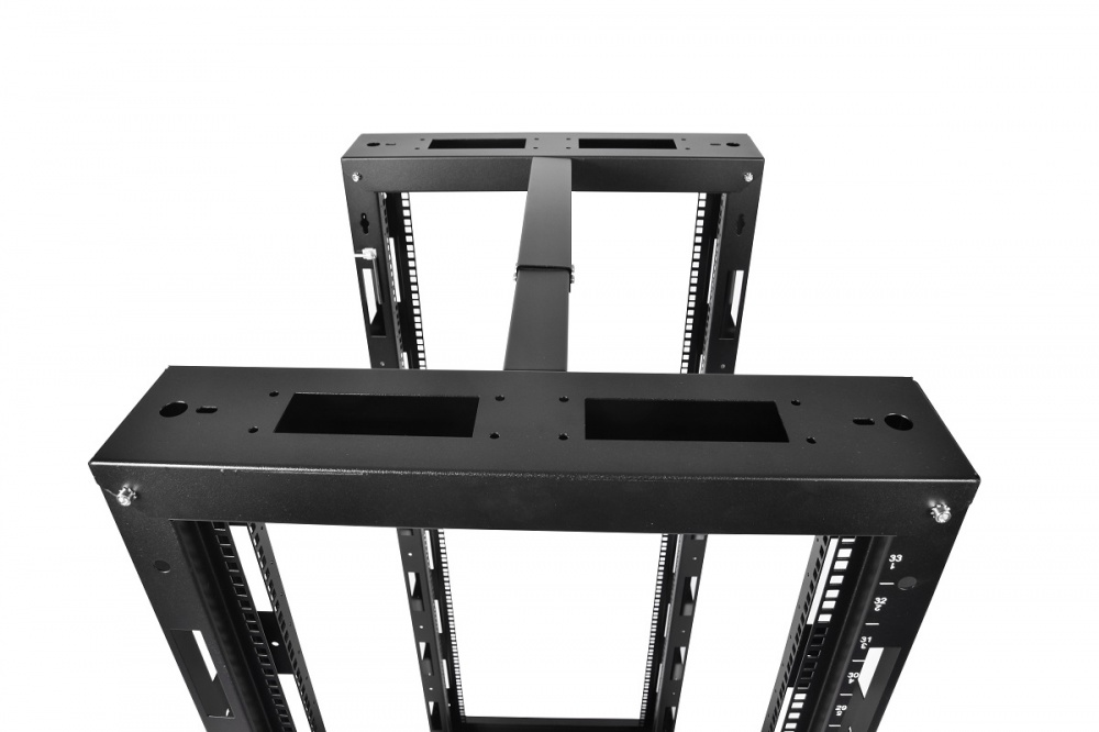 Универсальные стойки 19" имеют полностью разборную двухрамную конструкцию, каркас повышенной жесткости скреплен болтами с внутренними шестигранниками. Вертикальные направляющие имеют юнитовую маркировку. Для удобства монтажа и коммутации оборудования предусмотрены развитая перфорация, широкий спектр аксессуаров и система заземления. Двухрамная универсальная стойка 19" имеет регулировку полезной глубины – 750/620/580/450. При организации крупных коммутационных узлов возможно крепление стоек между собой через вертикальный кабельный органайзер. Удобство установки обеспечивают массивные опорные кронштейны и регулируемые винтовые опоры (ножки), компенсирующие неровности пола.В раме стойки предусмотрены отверстия для безинструментального монтажа блоков розеток.