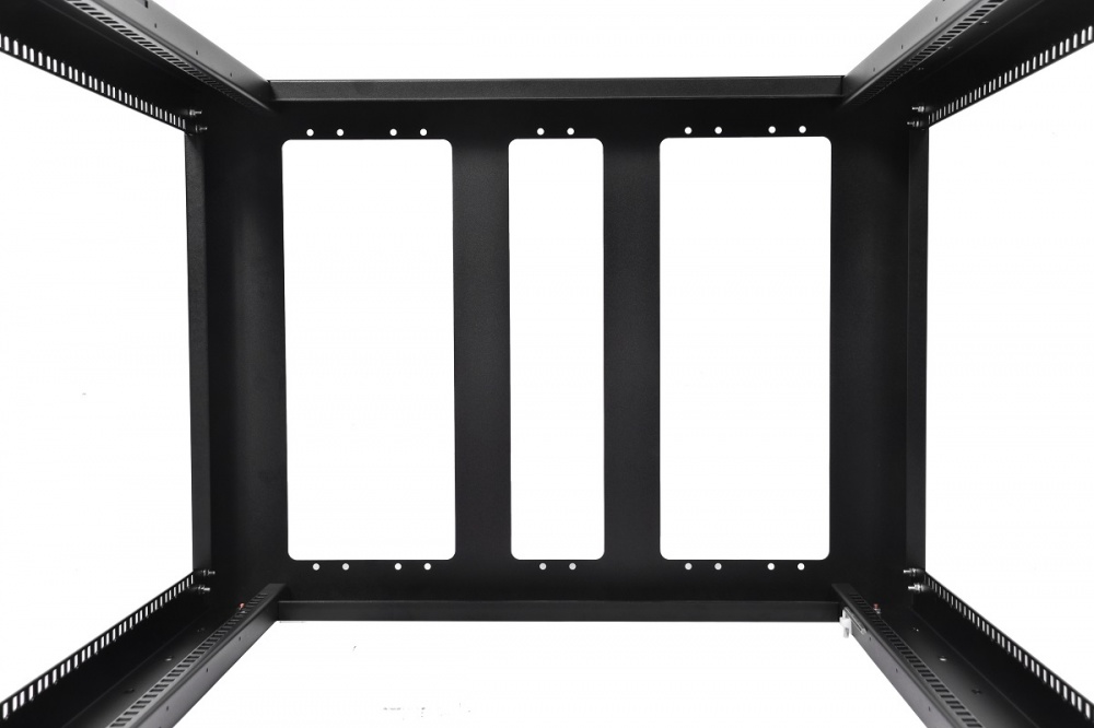 Стойка имеет полностью разборную двухрамную конструкцию. На вертикальные направляющие нанесена юнитовая маркировка. В раме стойки предусмотрены отверстия для безинструментального монтажа блоков розеток.