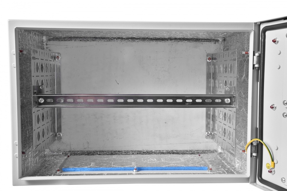 Корпус шкафа имеет металлическую сварную конструкцию, внутри покрыт термоизоляционным материалом. Дверь шкафа подготовлена для установки вентиляторов моделей и фильтра R-FAN, а также имеется предустановленная DIN-рейка для установки нагревателей/термореле/гигростата/датчиков. В комплект шкафа входят задняя оцинкованная панель и комплект вертикальных юнитовых панелей 19”.