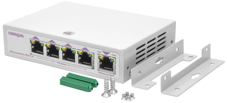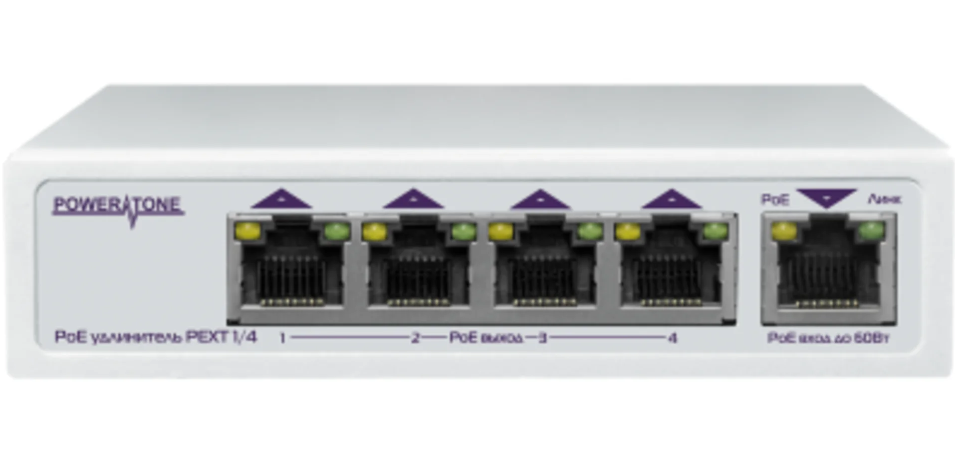 Ethernet соединения точка-точка ограничены длиной в 100м. Для того, чтобы преодолеть это ограничение в линейке устройств POWERTONE есть очень полезное устройство – PEXT 1/4, PoE удлинитель на 4 порта